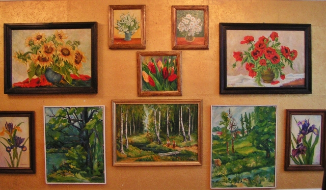 olejne, maluje też farbami wodnymi, na szkle, haftuje, wykonuje ozdoby z