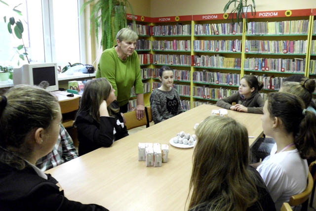 W trakcie oceniania testów uczniowie wzięli udział w lekcji o regionalizmie przygotowanej przez Pani± Halinę Krajewsk± i słodkim poczęstunku zorganizowanym przez Miejsko-Gminn± Bibliotekę Publiczn± w Poniatowej.