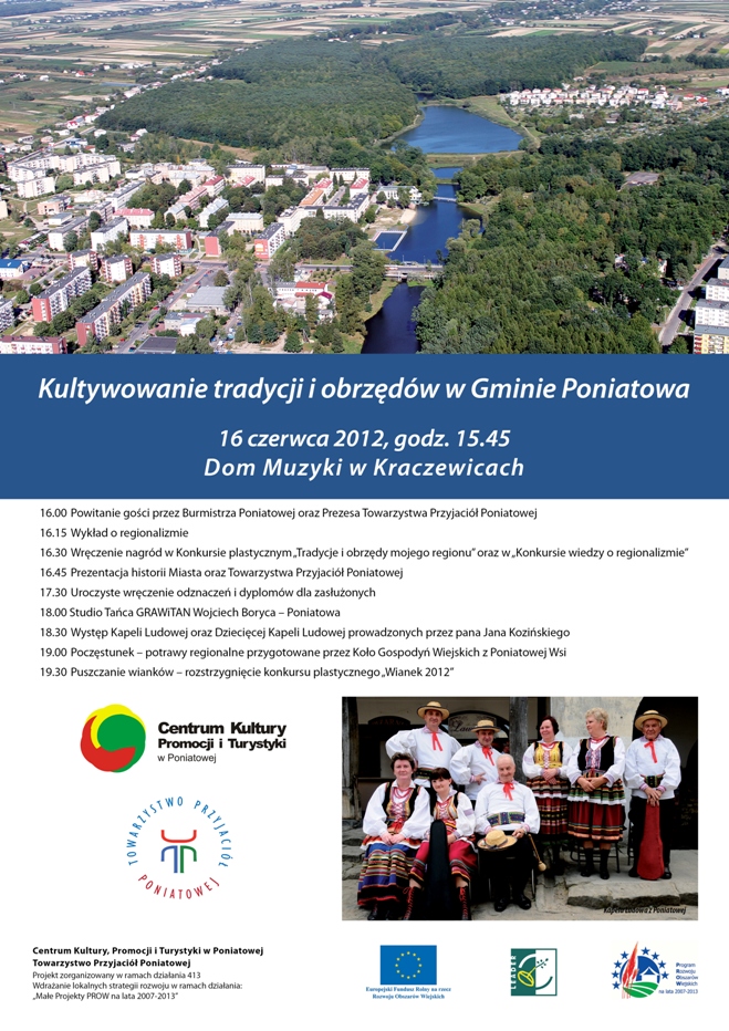 Dyplomami Wojewody Lubelskiego i Marszałka Województwa Lubelskiego zostali uhonorowani działacze Towarzystwa Przyjaciół Poniatowej. W imieniu Marszałka Województwa Lubelskiego Krzysztofa Hetmana dyplomy wręczał Dyrektor WOK dr Artur Sępoch, a w imieniu pani Wojewody Lubelskiego Prof. Jolanty Szołno-Koguc Prezes TPP Rafał Pastwa. Dyplomy Marszałka Województwa Lubelskiego otrzymali: Marta Bigos, Jadwiga Kisielewska, Zofia Libicka-Peroń i Teresa Roziewicz Dyplomy Wojewody Lubelskiego otrzymali: Zbigniew Małecki, Zbigniew Małyska, Elżbieta Olszowa i Jacek Olewiński Następnie w klimat sielskości wprowadził uczestników imprezy występ Kapeli Ludowej z Poniatowej, która swoją muzyką nawiązującą do tradycji naszego regionu, wzbudziła zachwyt zgromadzonej publiczności. Dziecięca Kapela Ludowa z Poniatowej na zakończenie występu zachęcała zebranych do kibicowania naszym piłkarzom wykonując własne wydanie hitu Koko Euro Spoko. Podczas imprezy można było spróbować regionalnych dań przygotowanych przez panie z Koła Gospodyń Wiejskich z Poniatowej Wsi. Miejscowe „Bociany" cieszyły się dużą popularnością. Na zakończenie uroczystości organizowanych 16 czerwca odbył się konkurs „Puszczania wianków” przy zalewie miejskim w Poniatowej. Obrzęd ten nawiązujący do tradycji Nocy Świętojańskiej, już od paru lat integruje mieszkańców Poniatowej. W tym roku zwyciężyła kompozycja pań ze Stowarzyszenia Amazonki. Drugie miejsce zdobył wianek Szkoły Podstawowej im. Henryka Sienkiewicza w Kowali. Nasz wianek uwity przez panie z Poniatowskiego Uniwersytetu Trzeciego Wieku zdobył trzecie miejsce.